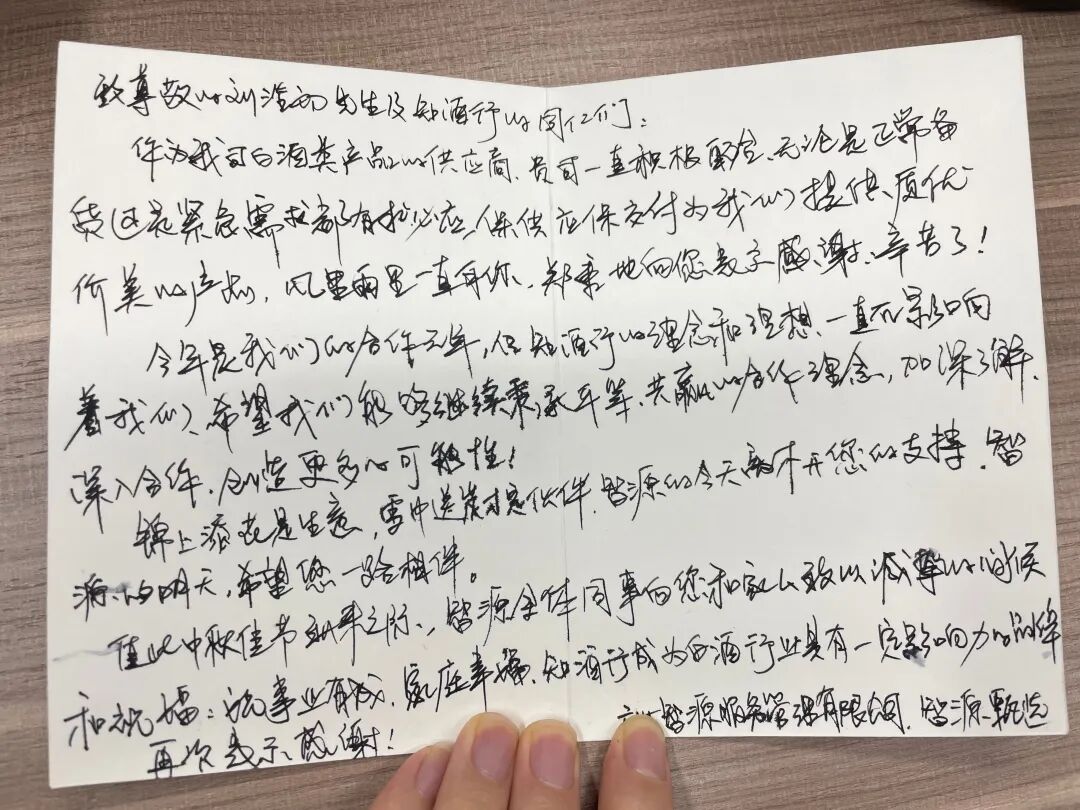 中秋佳节将至,倍感惊喜的收到广州智源服务管理有限公司提前给知酒行送来感谢信和祝福。收到这份手写的祝福卡片,感受到了的贵公司浓浓心意,荣幸之至。